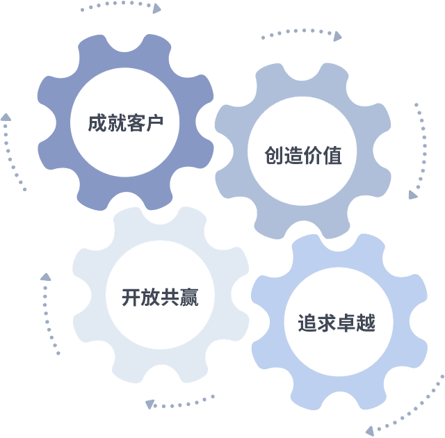 成就客户是一切决策的出发点,,,,创造价值是衡量所有工作的标准,,追求卓越是我们做事做人的态度,,开放共赢是我们的格局也是最终的结果。。。价值观的齿轮环环相扣,,推动着组织里的每个人不断向前。。