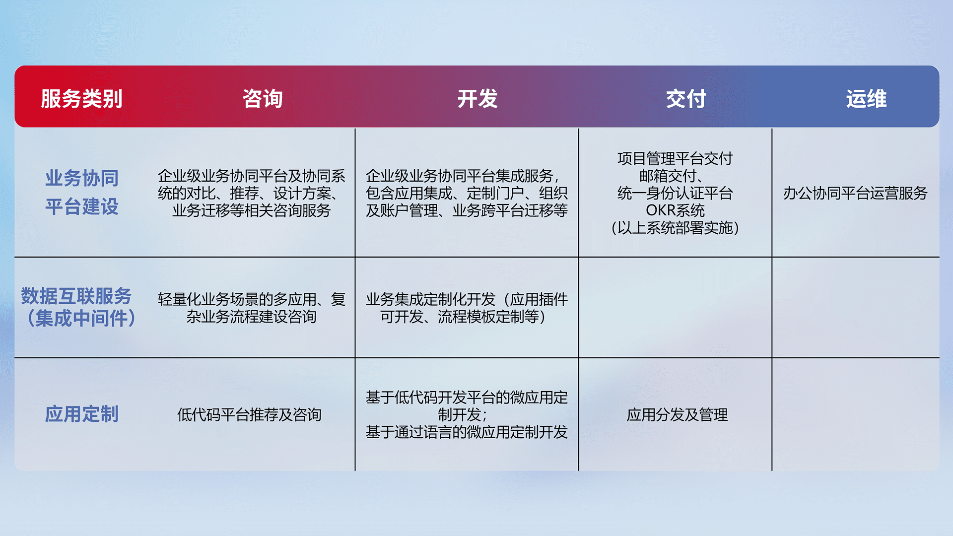 针对钉钉、、企微、、IDaas等平台级产品提供产品的规划、、方案、、、交付、、定制化开发等服务,,,,实现如统一协同办公、、智能客户服务、、、、混合会议管理、、、、智能数据查询、、等业务场景,,,,实现数字化转型。。。